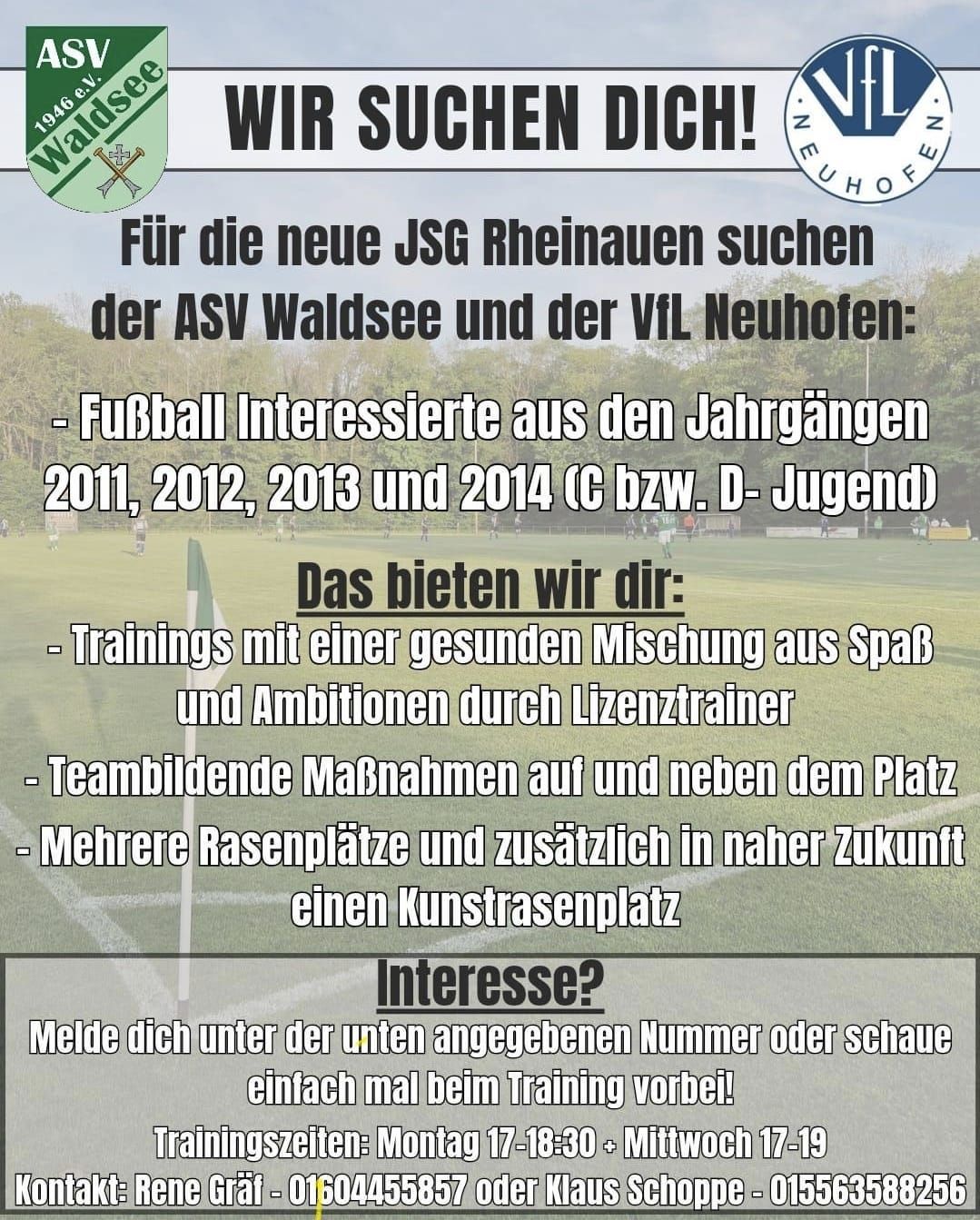 Wer daran interessiert ist, bei der JSG Rheinauen mitzumachen, kann sich bei den Ansprechpartnern Rene Gräf (ASV Waldsee, Telefon: 0160 44 55 857) und Klaus Schoppe (VfL Neuhofen, Telefon: 0155 / 63 58 82 56) melden oder einfach beim Training vorbeischauen. Die Trainingszeiten sind montags von 17 bis 18:30 Uhr und mittwochs von 17 bis 19 Uhr.